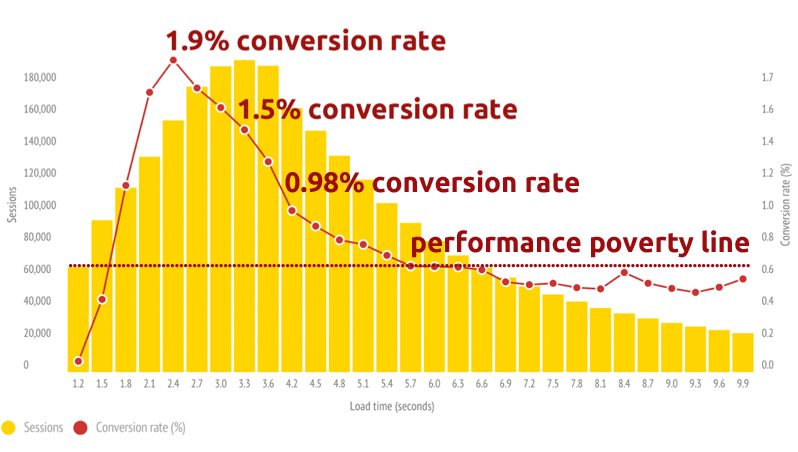 Faster pages lead to higher conversion rates. SOASTA’s case study, the effect of page load times on conversion rates, found that a load time of 2.4 seconds had a sweet spot conversion rate of 1.9%. They also found that a page that at 3.3 seconds dropped to a 1.5% conversion rate, meaning that a page that loaded one second faster increased conversion rate by 27%.